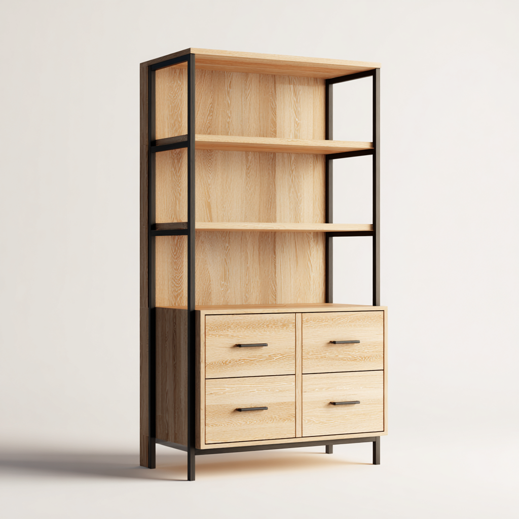 Dieses moderne Bücherregal kombiniert eine offene Holzstruktur mit einem stabilen Metallrahmen und bietet eine funktionale sowie ästhetische Aufbewahrungslösung für Wohn- und Arbeitsbereiche. Die obere offene Ablagefläche eignet sich ideal zur Präsentation von Büchern und Dekorationsobjekten, während der untere Bereich zusätzlichen geschlossenen Stauraum bietet.