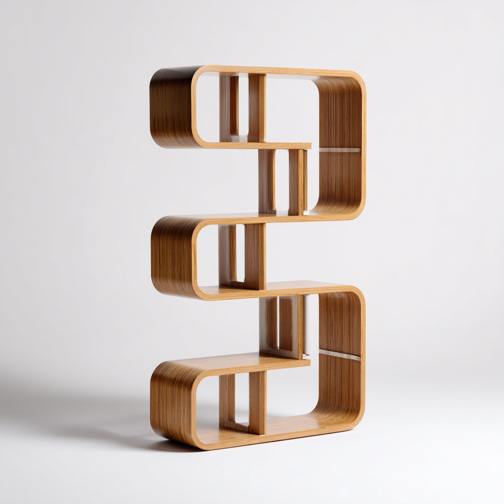 Dieses moderne Bücherregal in S-Form bietet eine dekorative und zugleich funktionale Lösung für Wohn- und Arbeitsbereiche. Die fließenden Rundungen und die offene Struktur schaffen eine ästhetische Präsentation für Bücher und Dekorationsobjekte.