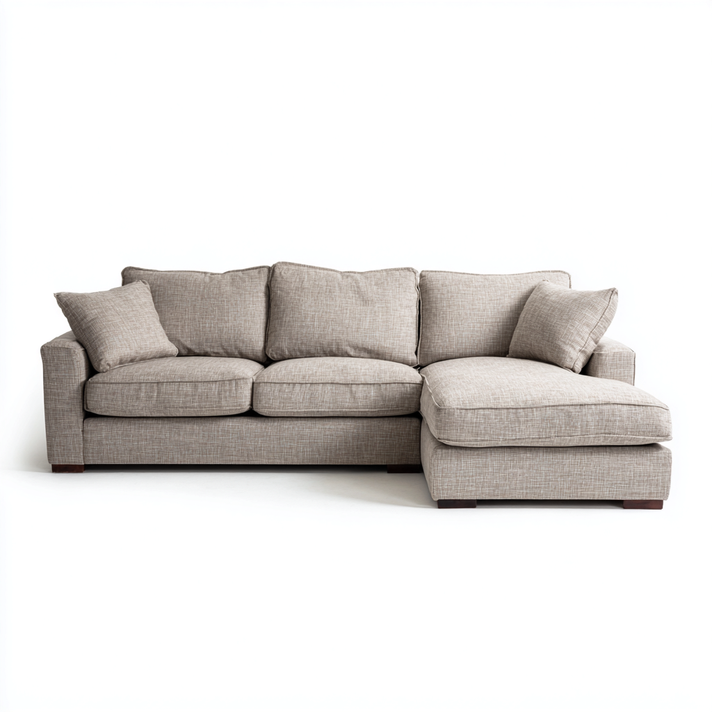 Dieses Ecksofa bietet eine großzügige Sitzfläche und eignet sich ideal für entspannte Stunden im Wohnzimmer. Die klare Formgebung fügt sich harmonisch in moderne Wohnräume ein und sorgt für ein angenehmes Wohngefühl.