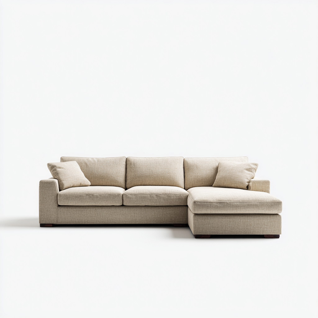 Das Sofa ist vollständig mit beigem Stoff bezogen. Die Nähte sind sauber verarbeitet und das robuste Untergestell sorgt für Stabilität im täglichen Gebrauch.