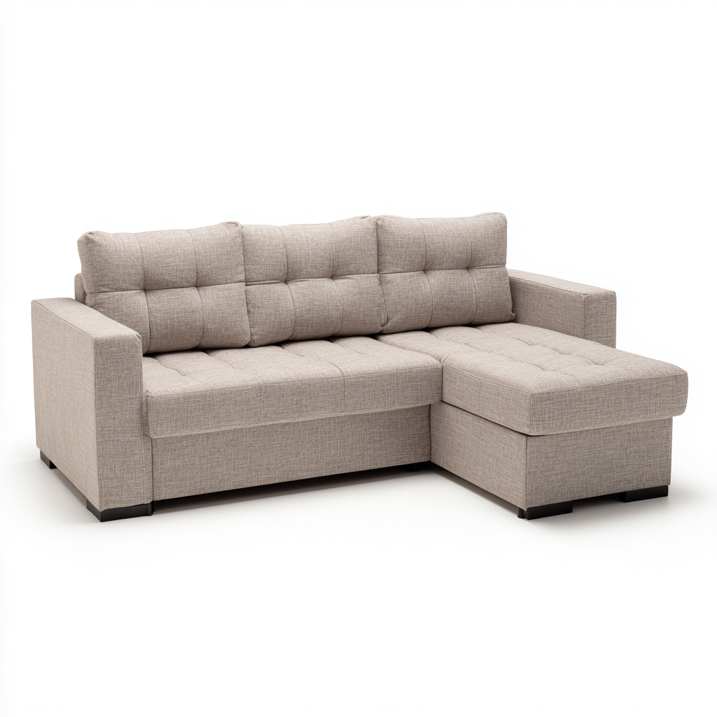 Das Sofa ist vollständig mit beige-farbenem Stoff bezogen,der eine weiche Haptik bietet und gleichzeitig pflegeleicht ist.Die stabile Grundkonstruktion unterstützt dauerhafte Formstabilität und eine lange Lebensdauer.