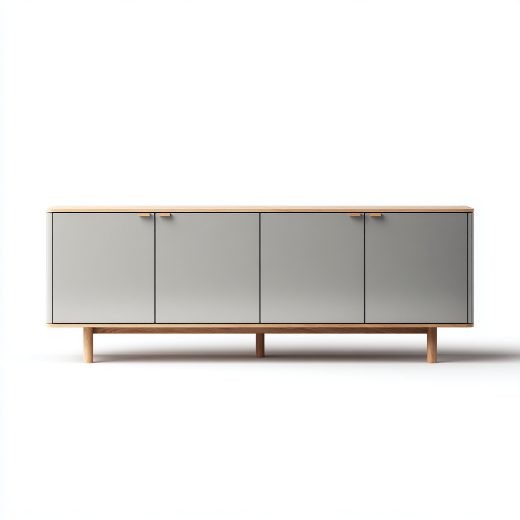 Das Lowboard besteht aus robustem Holzwerkstoff mit einer glatten grauen Front und einer natürlichen Holzoberfläche. Die vier Türen mit dezenten Griffen sorgen für ein sauberes Erscheinungsbild und die Farbkombination Grau/Holz schafft einen modernen, freundlichen Wohncharakter.