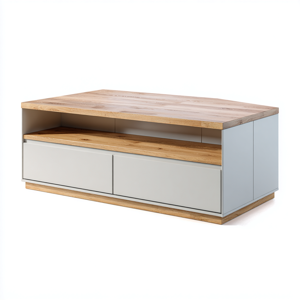 Das offene Fach eignet sich ideal für Mediengeräte oder Dekoration. Die darunterliegenden Schubladen bieten Stauraum für Zubehör und Alltagsgegenstände. Die klare Linienführung erleichtert die Integration in verschiedene Wohnstile.