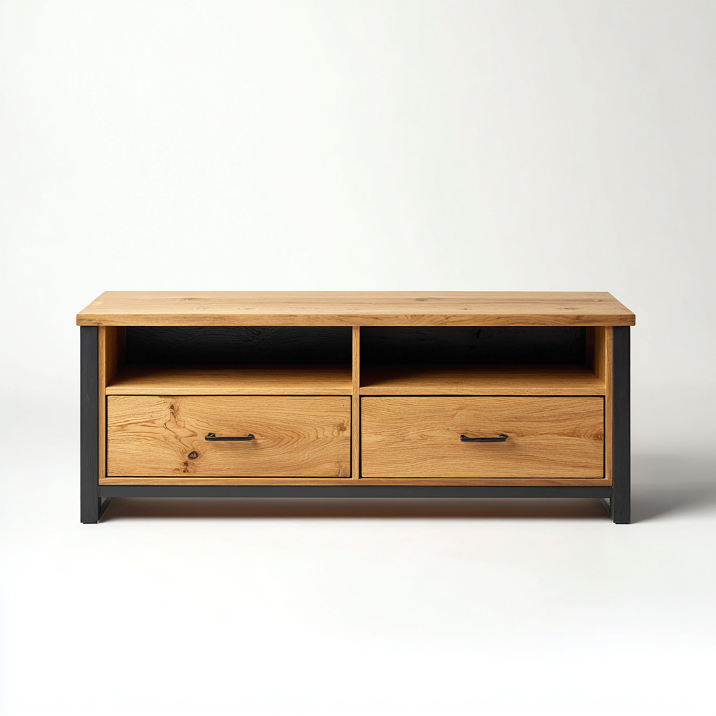 Die großzügige Abstellfläche eignet sich für Fernseher und Dekorationsobjekte. Zwei offene Fächer bieten Platz für Unterhaltungselektronik oder Mediengeräte, während die geschlossenen Staubereiche eine ordentliche Aufbewahrung von Zubehör und Alltagsgegenständen ermöglichen.