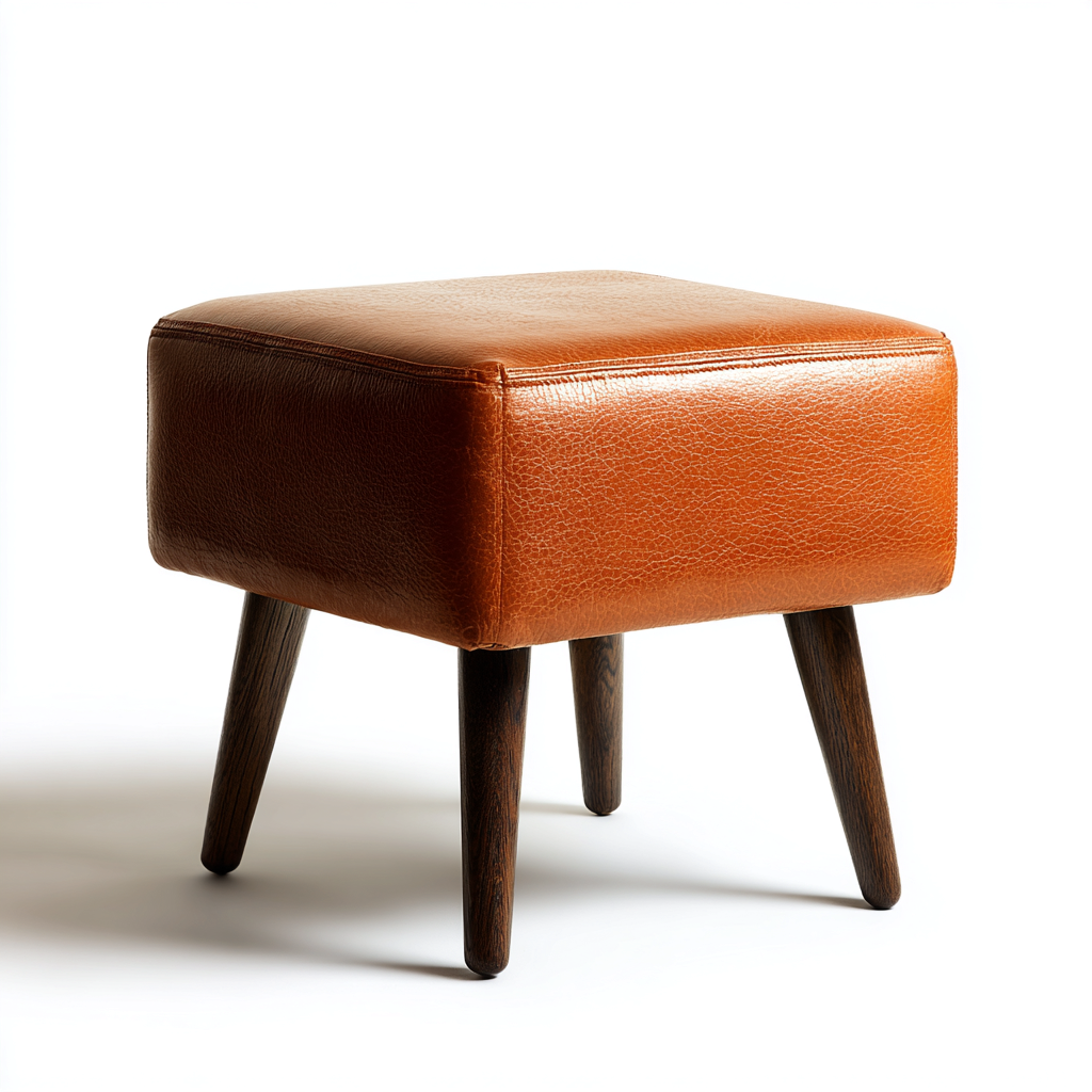 Der Fußhocker verfügt über einen braunen Kunstlederbezug mit feiner Struktur. Die stabilen Holzbeine sorgen für zuverlässigen Halt und verleihen dem Design eine warme natürliche Note.
