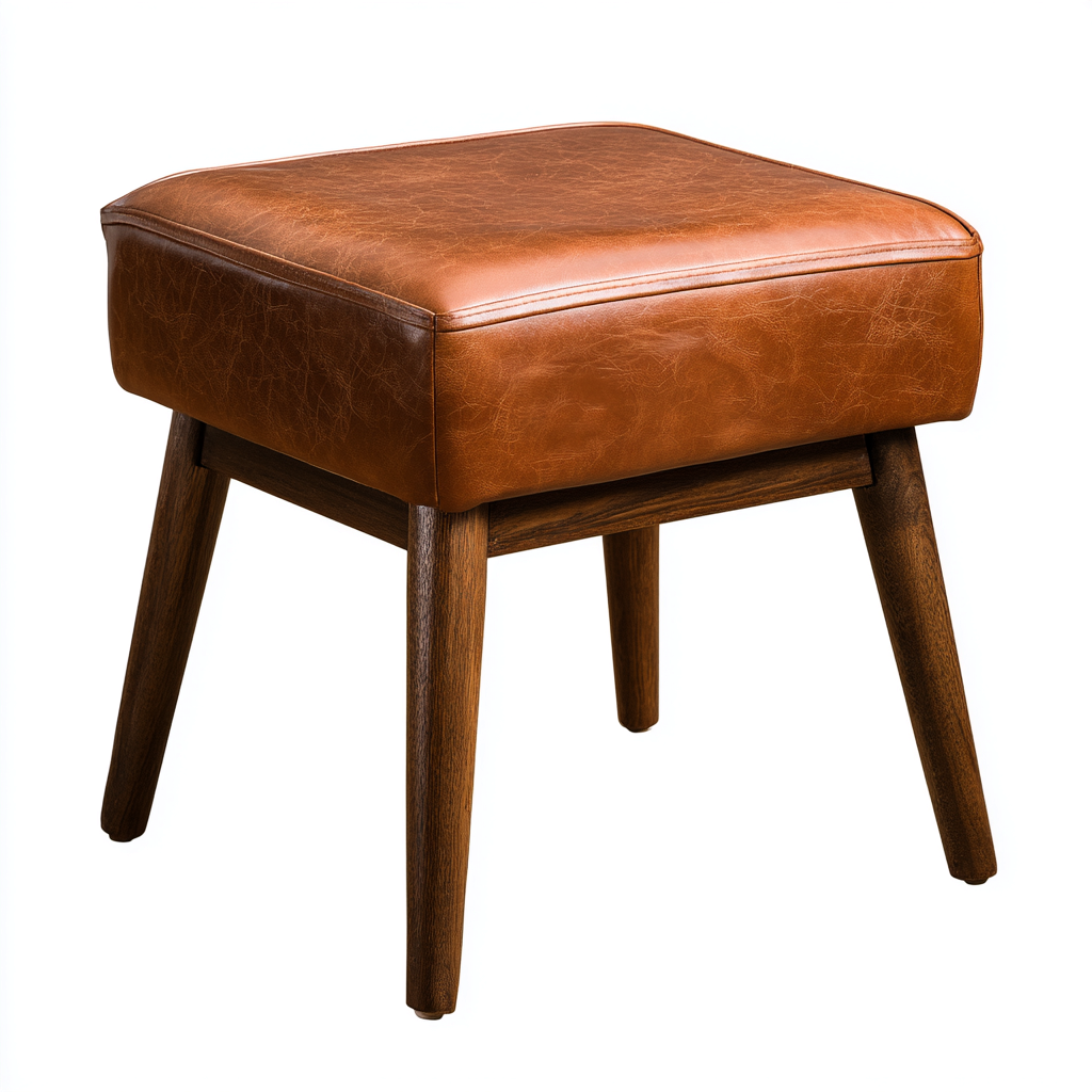 Der Sitz ist mit braunem Kunstleder bezogen, das durch seine feine Struktur eine hochwertige Anmutung vermittelt. Das stabile Holzgestell und die konischen Holzbeine sorgen für zuverlässigen Halt und einen warmen natürlichen Look.