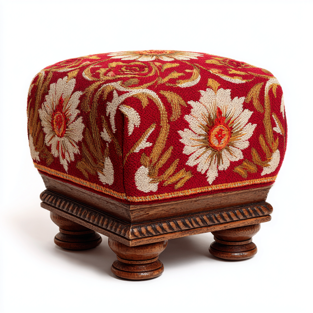 Die Sitzfläche besteht aus rotem Stoff mit aufwendigem floralen Muster. Der stabile Holzsockel mit gedrehten Füßen sorgt für eine langlebige und hochwertige Verarbeitung.