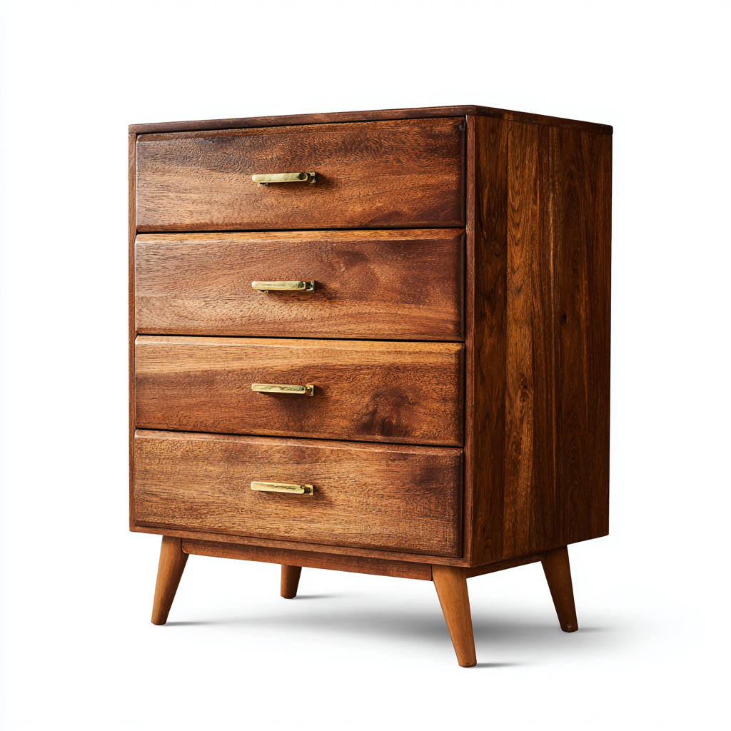 Diese Kommode mit Schubladen besteht vollständig aus naturfarbenem Massivholz und bietet eine stilvolle sowie langlebige Stauraumlösung für das Wohnzimmer. Die warme Holzmaserung und die schlanken Proportionen im Mid-Century-Stil verleihen dem Möbelstück ein elegantes und zeitloses Erscheinungsbild.