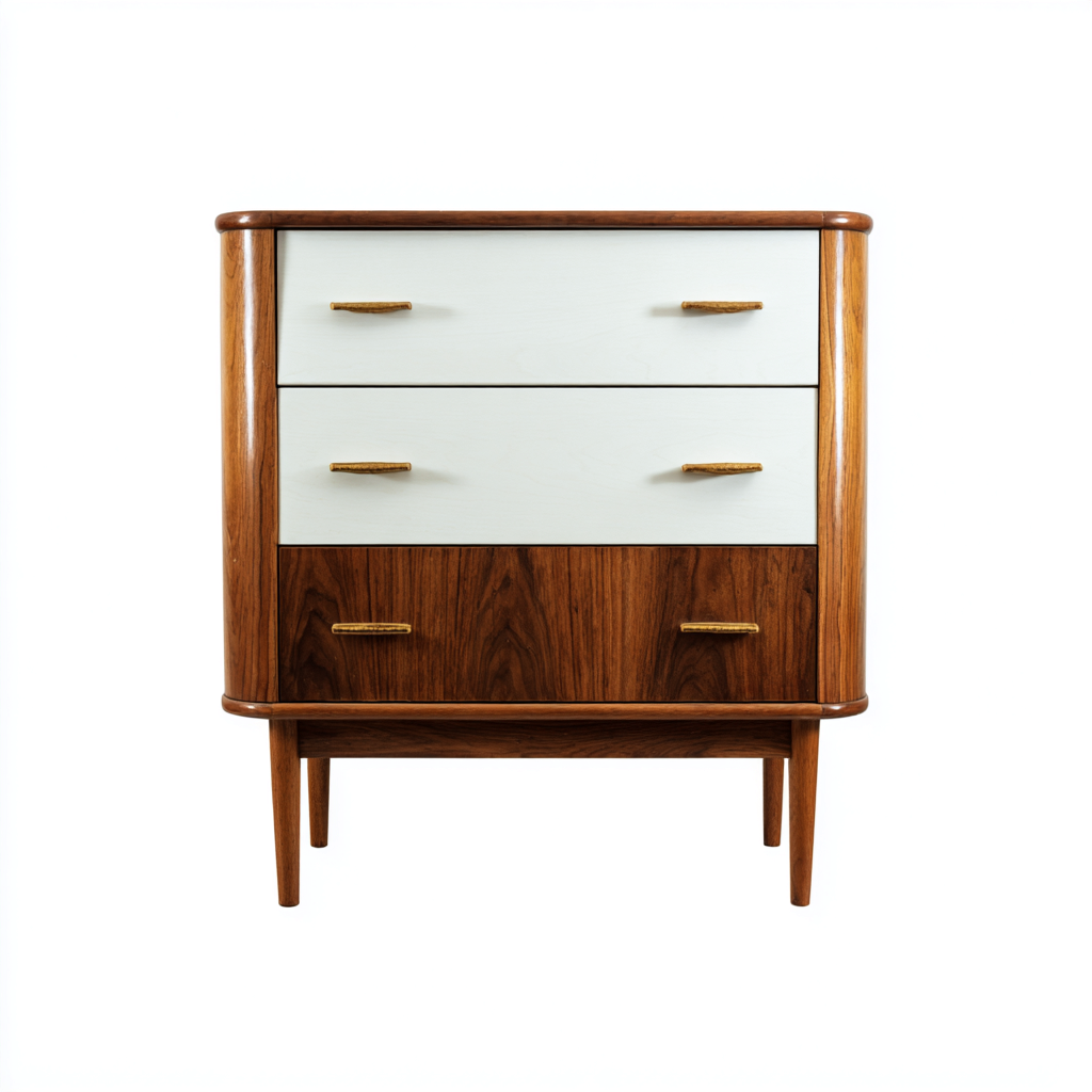Die Kommode besteht aus massivem Holz in Braun, dessen natürliche Maserung sichtbar bleibt. Die weißen Fronten besitzen eine fein geschliffene, widerstandsfähige Oberfläche. Die dezenten Metallgriffe in warmer Farbgebung ergänzen das Gesamtbild und sorgen für eine angenehme Bedienung.