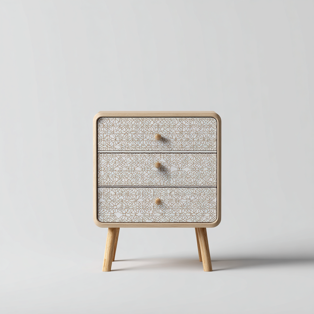 Der Rahmen besteht aus naturfarbenem Massivholz, während die Frontflächen aus weißem MDF mit grafischem Muster gefertigt sind. Die leicht abgerundeten Kanten sowie die harmonischen Holzgriffe runden das moderne Erscheinungsbild ab.