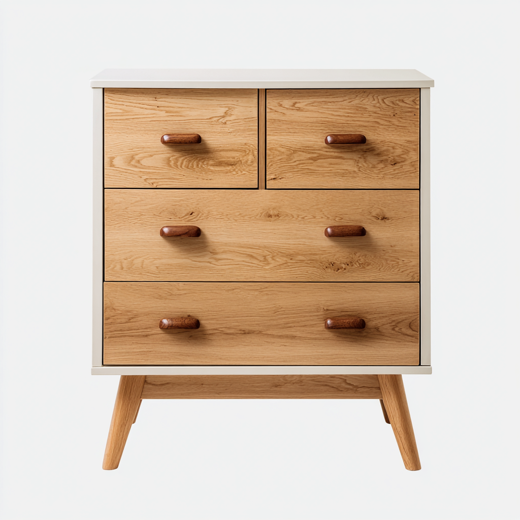 Die Kommode besteht aus einem weißen MDF-Rahmen und naturfarbenen Massivholzfronten. Die Oberfläche ist glatt verarbeitet und bringt die natürliche Struktur des Holzes gut zur Geltung. Die Griffe aus Holz fügen sich harmonisch in das Gesamtbild ein.