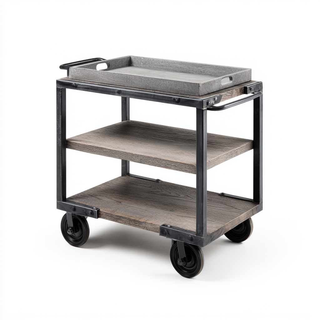 Gefertigt aus stabilem Metallrahmen in Grau und Holzablagen in Naturton; die obere Tablettablage ist abnehmbar und erleichtert Servieren und Reinigung.