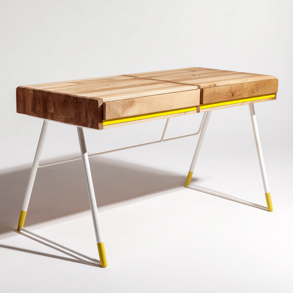 Dieser moderne Schreibtisch verbindet eine warme Holzoptik mit einem auffälligen weiß-gelben Metallgestell und eignet sich ideal für kreative Büro- und Arbeitsumgebungen. Die klare Formensprache und die zweifarbigen Akzente verleihen dem Arbeitsplatz eine stilvolle und dynamische Atmosphäre.
