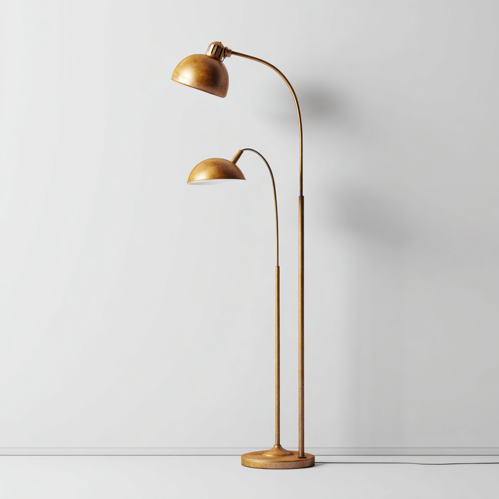 Die Stehlampe verfügt über zwei separate Leuchtarme, die gerichtetes Licht spenden und sich ideal für Lese- oder Arbeitsbeleuchtung eignen. Das Design bietet sowohl funktionale als auch dekorative Vorteile und kann flexibel in unterschiedlichen Wohnbereichen eingesetzt werden.