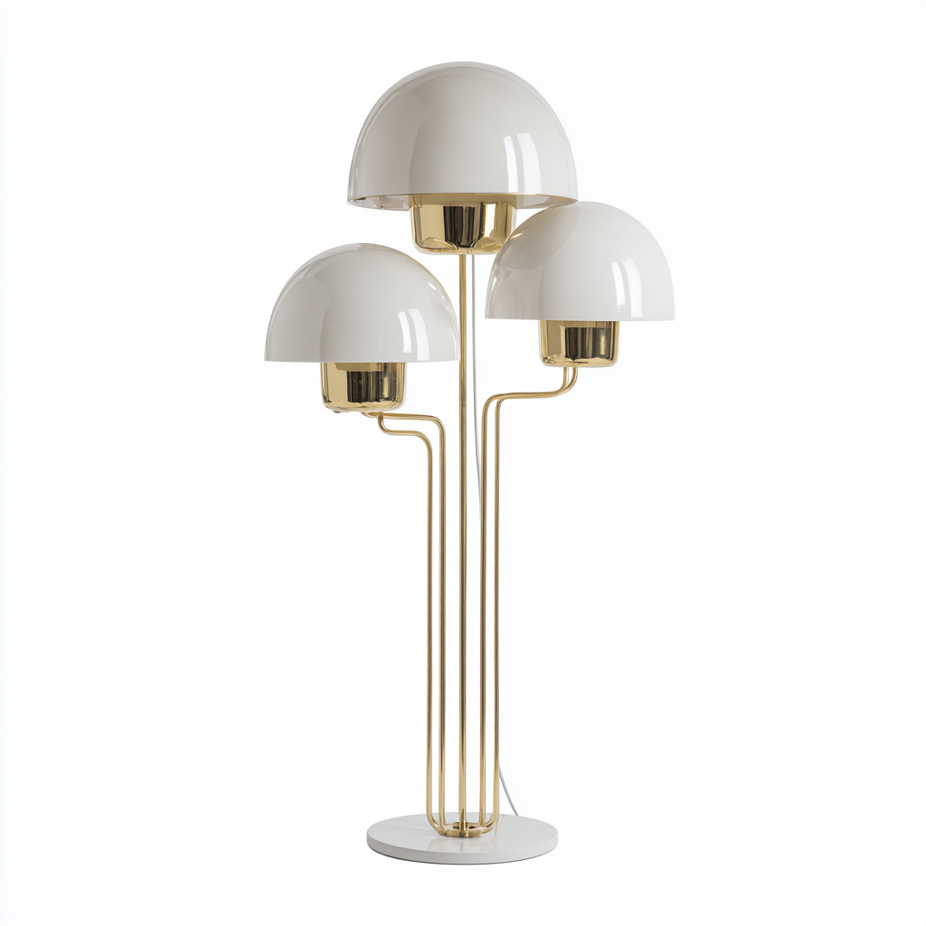 Diese moderne Stehlampe verfügt über drei halbkugelförmige Lampenschirme und ein elegant geschwungenes Metallgestell. Sie eignet sich ideal für eine stilvolle Beleuchtung im Wohnzimmer.