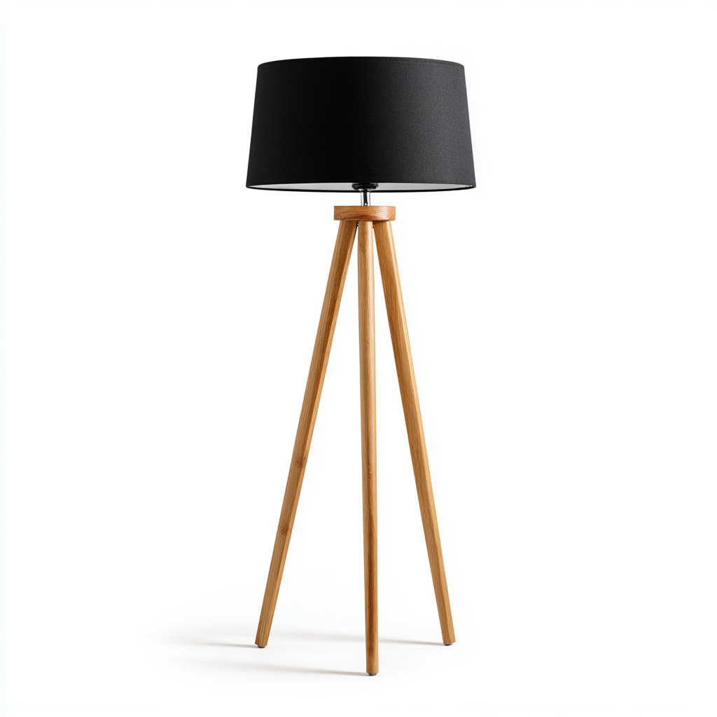 Diese moderne Stehlampe kombiniert einen klassischen schwarzen Stoffschirm mit einem stabilen dreibeinigen Holzgestell. Das warme Naturholz bildet einen harmonischen Kontrast zum dunklen Lampenschirm und schafft eine angenehme Lichtwirkung in verschiedenen Wohnbereichen.