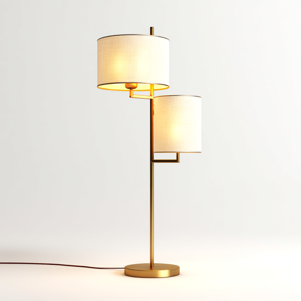 Diese moderne Stehlampe kombiniert zwei zylindrische Stoffschirme in warmweißem Farbton mit einem eleganten goldfarbenen Metallgestell. Die zweistufige Anordnung der Lampenschirme sorgt für eine harmonische Lichtverteilung und setzt stilvolle Akzente im Wohnbereich.