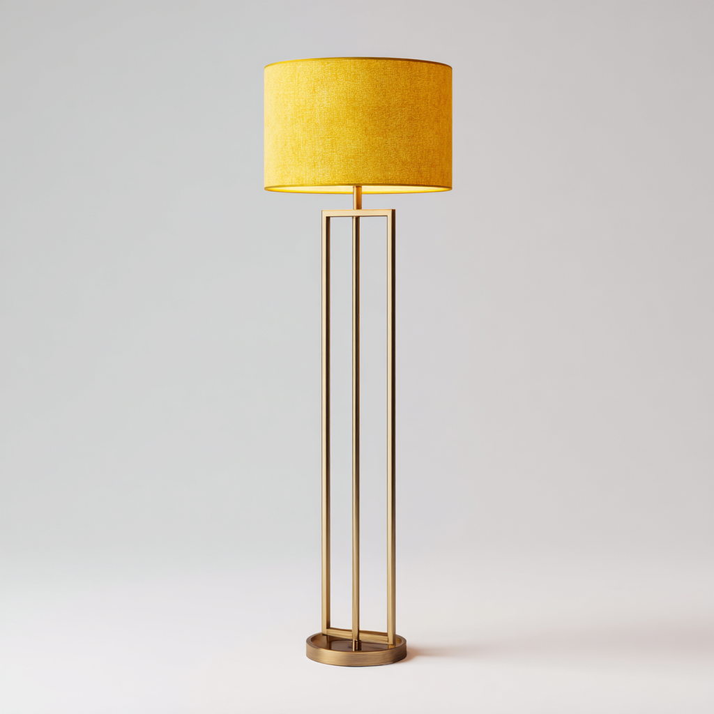 Diese moderne Stehlampe kombiniert einen zylindrischen gelben Stoffschirm mit einem filigranen goldfarbenen Metallgestell. Die geometrische Linienführung verleiht der Lampe einen eleganten, zeitgenössischen Charakter und macht sie zu einem stilvollen Lichtakzent im Wohnbereich.
