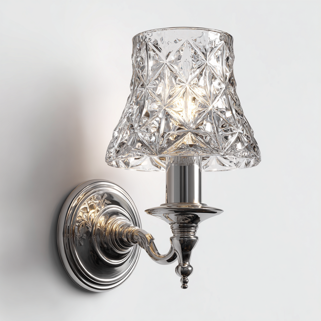 Diese Wandleuchte kombiniert einen verzierten Metallkörper in Chromoptik mit einem kunstvoll geschliffenen Glasschirm. Sie eignet sich ideal für Wohnzimmer, Flure oder Schlafzimmer und sorgt für ein elegantes und warmes Lichtbild.
